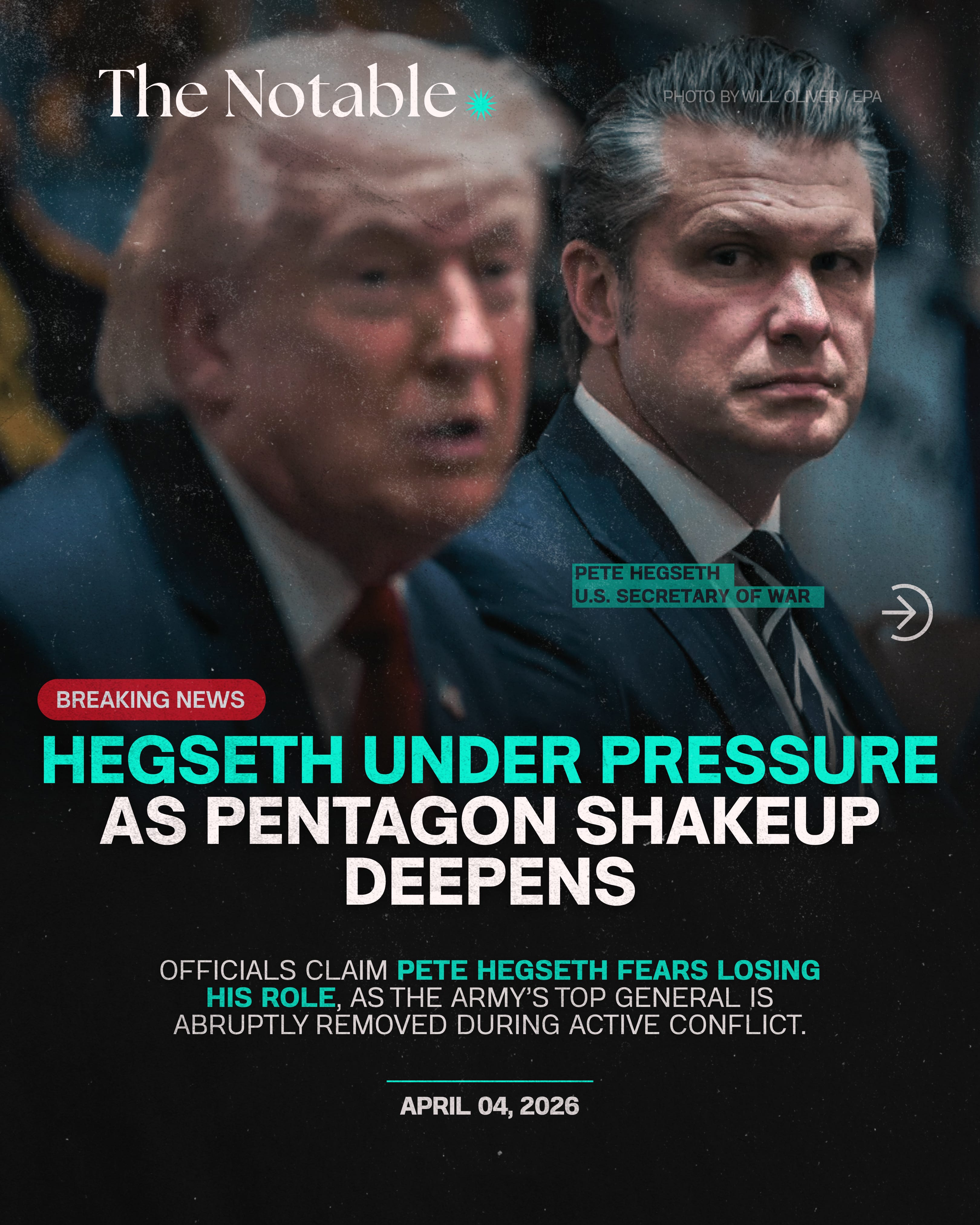 Officials claim Pete Hegseth fears losing his role, as the army's top general is abruptly removed during active conflict. (April 4, 2026)