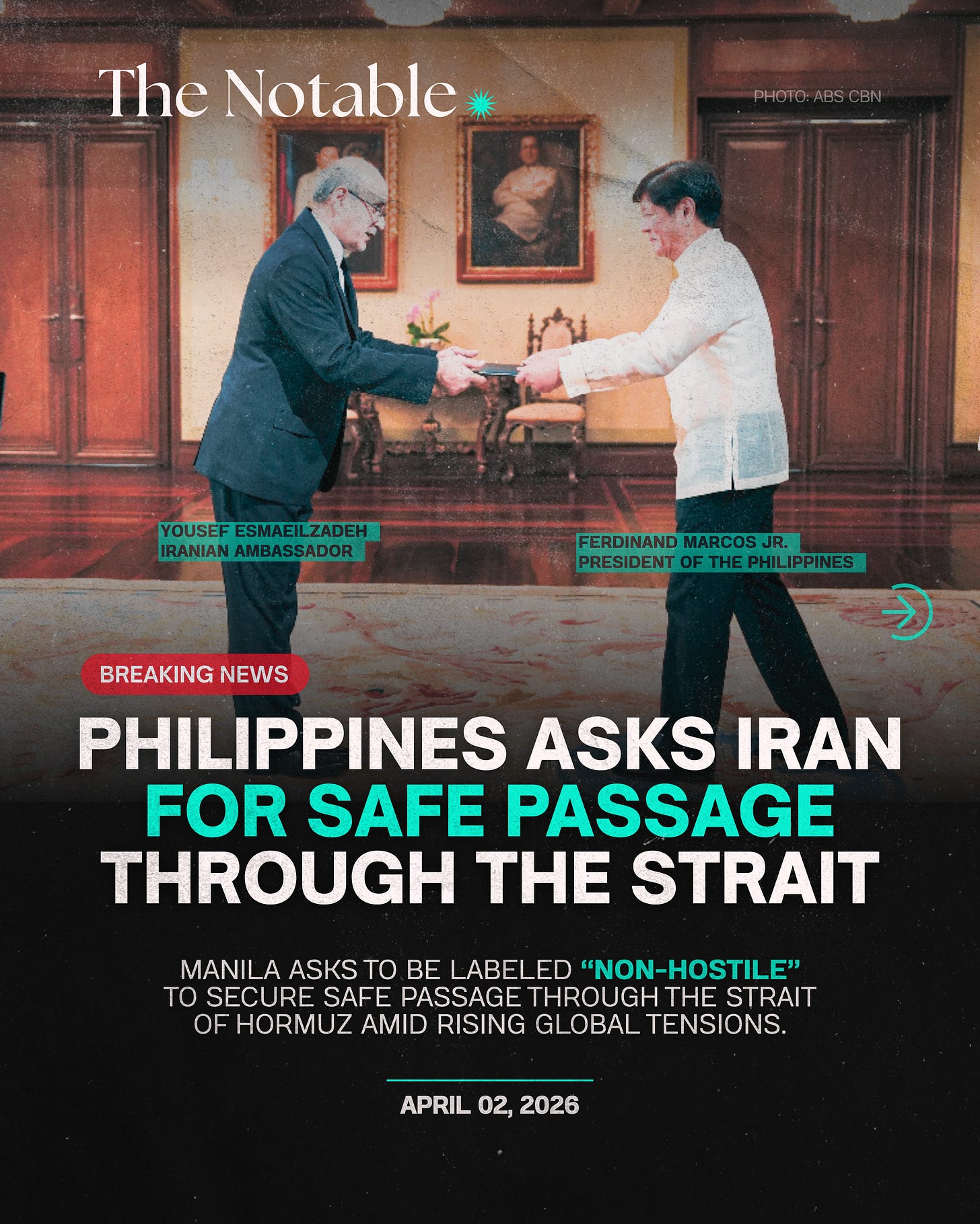 Manila asks to be labeled "non-hostile" to secure safe passage through the Strait of Hormuz amid rising global tensions. (April 2, 2026)