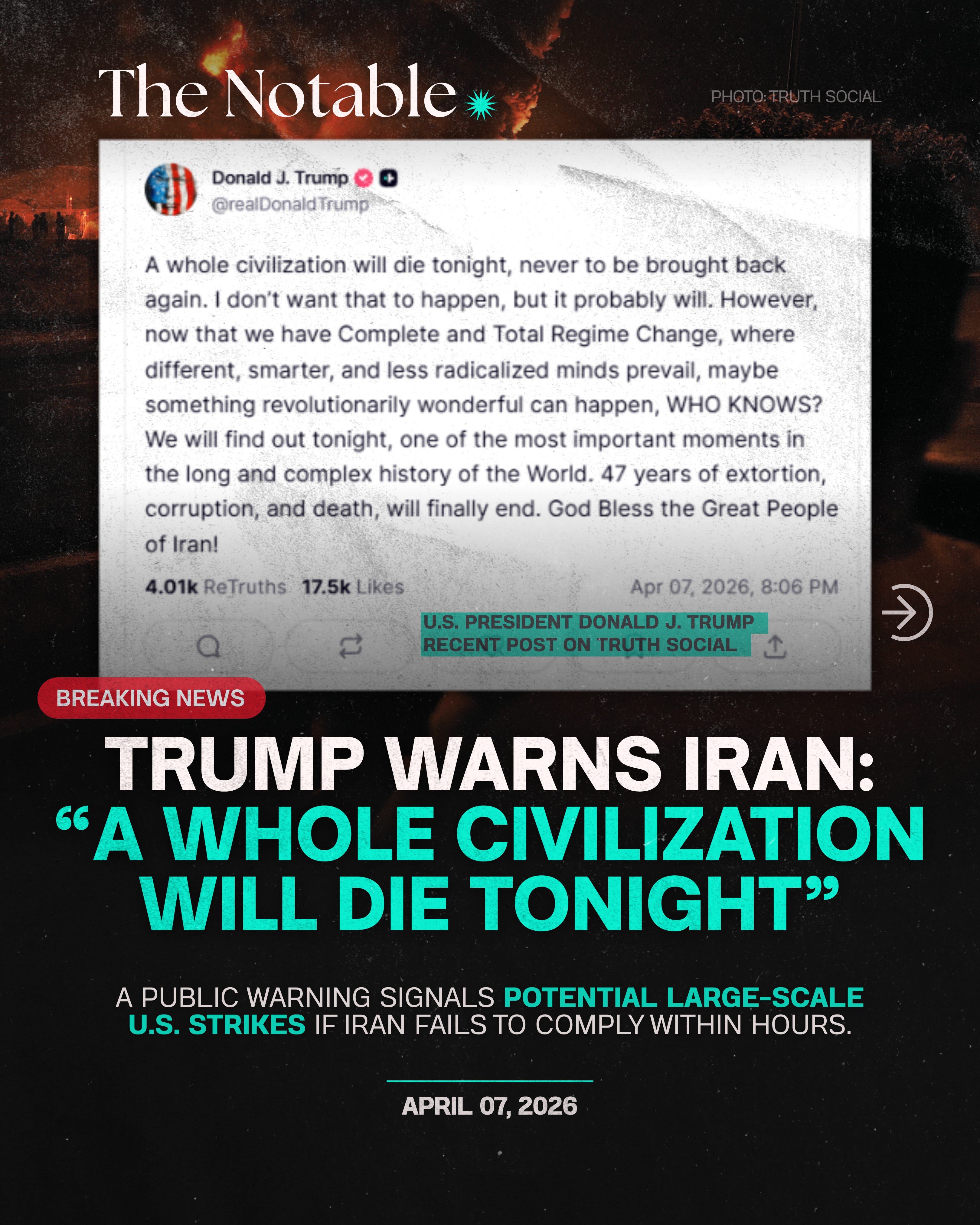 On April 7, President Donald Trump issued one of the starkest warnings of the current conflict with Iran, writing that “a whole civilization will die tonight” if Tehran fails to meet a U.S. deadline.