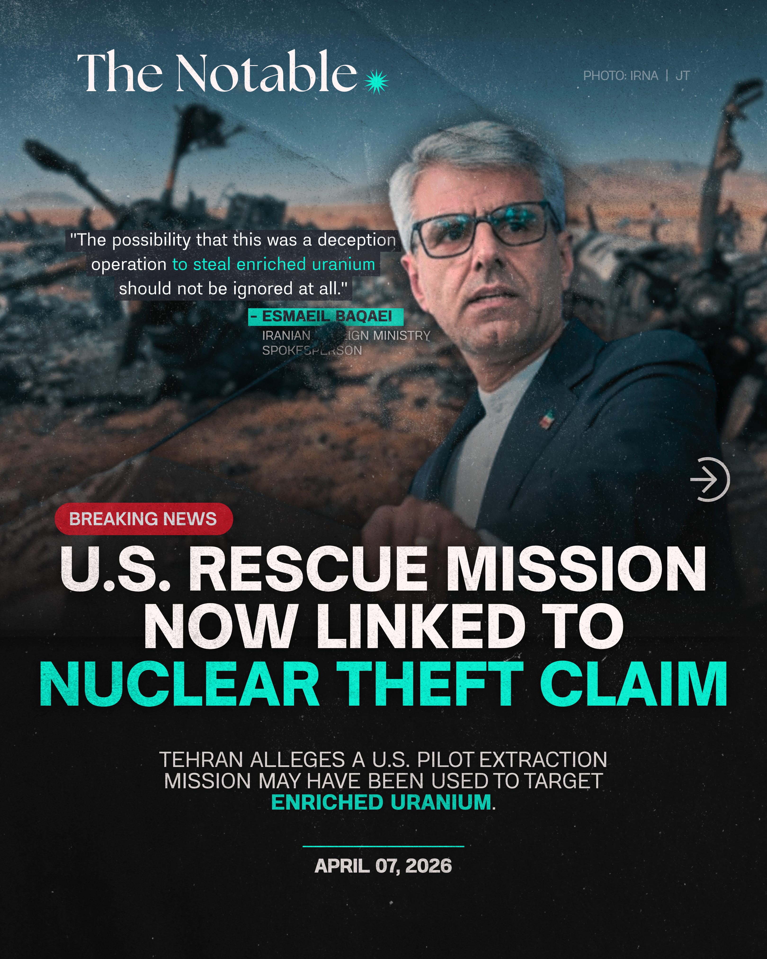 Tehran alleges a U.S. pilot extraction mission may have been used to target enriched uranium. (April 7, 2026)